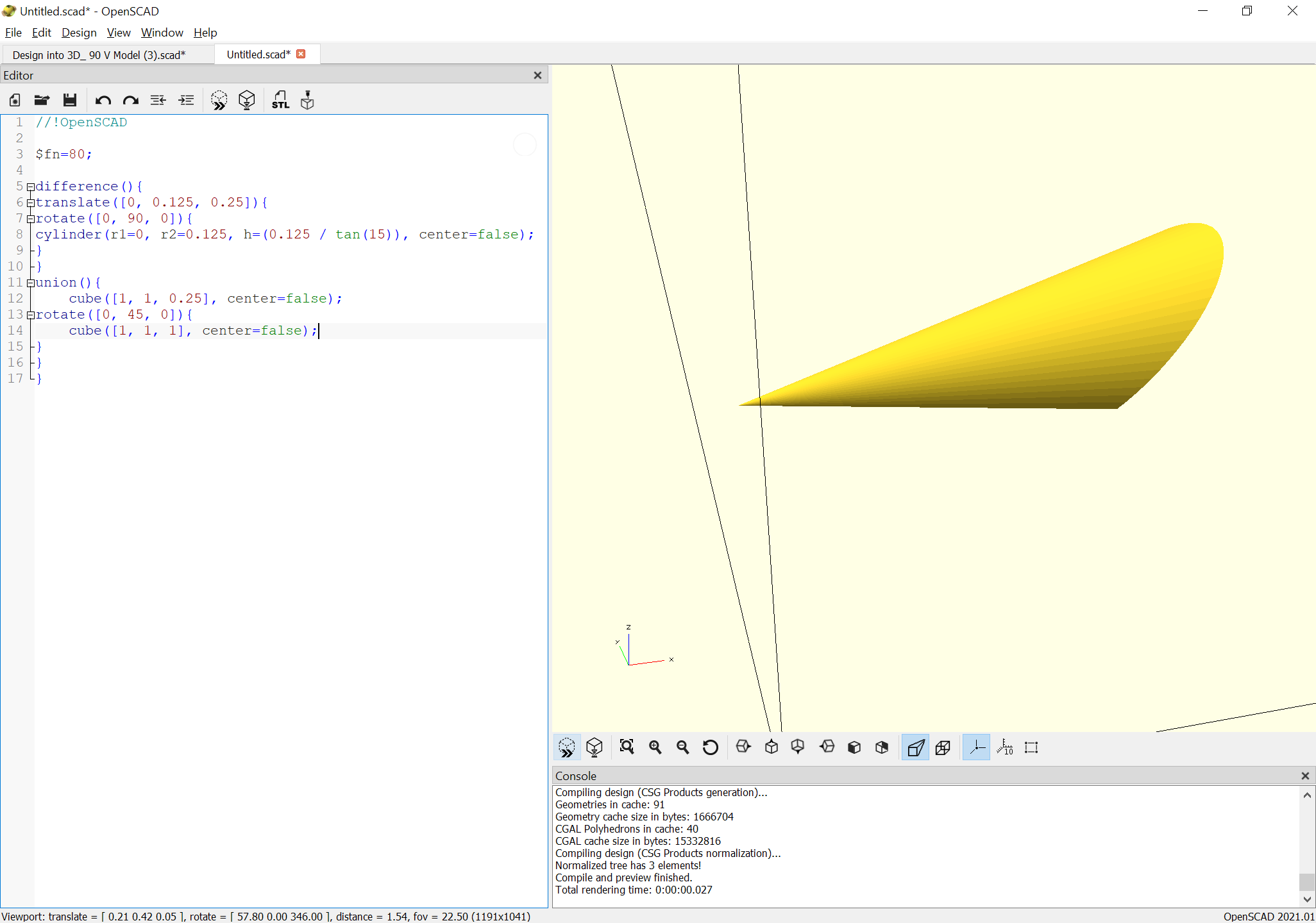 cylinder(r1=0, r2=0.125, h=(0.125 / tan(15)), center=false);