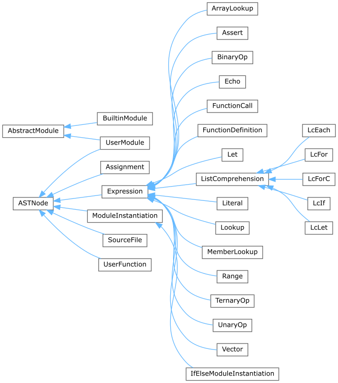 Note that ASTNodes often do not have direct ASTNode children. SourceFile, for instance - which is the root of the tree - contains a LocalScope, and LocalScope contains an AssignmentList containing all of the assignments, a vector of ModuleInstantiations that contains the module instantiations, and vectors of UserFunction and UserModule that contain those definitions. Similarly, ModuleInstantiation contains an AssignmentList of the module arguments, and a LocalScope describing the body. I don't know how well that heterogeneous data structure fits into the visitor pattern. (Again, noting that I have limited OO experience... when I say "I don't know" there, it means that I don't know; it's not a euphemism for "it doesn't work". It's just not instantly obvious to me that it does work.)