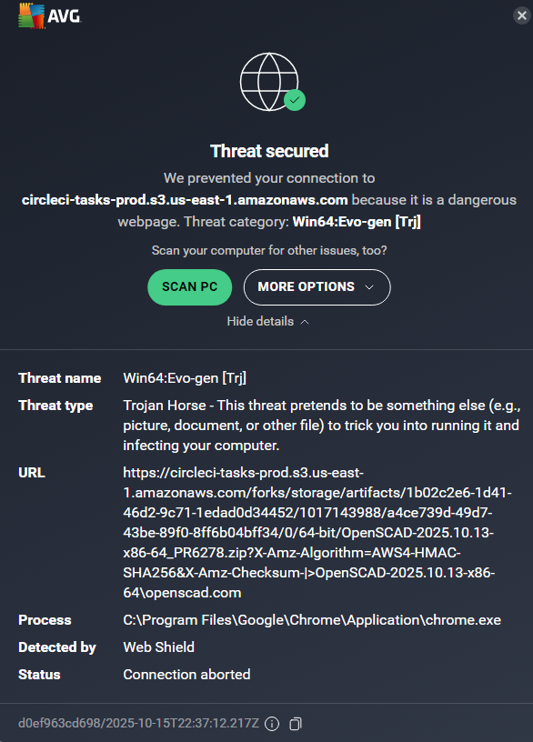 specifically saying that openscad.com has the Win64:Evo-gen Trojan.