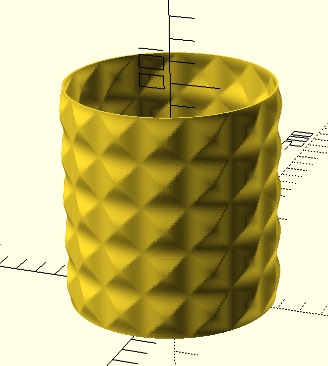 The fact that you can generate the diamonds I originally needed for knurling via the 2-wave method was actually an interesting surprise to me, though it's far more expensive in vertex counts. The manually created heightfield texture for diamonds in BOSL2 is actually just [[0,1], [1,0]].
