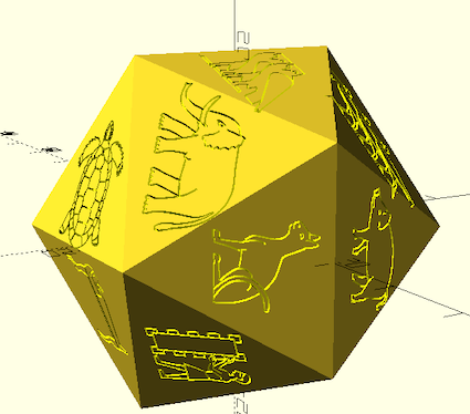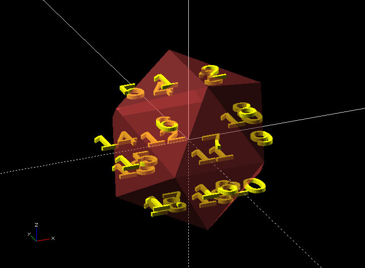 Note that the text is 2D so won’t render. Worse, if I extrude the text and union it with the polyhedron, the mesh isn’t closed and it still won’t render. Maybe that has to be built of equilateral triangles moved into position the way the text is, but then we have to figure out how each triangle has to be rotated first.