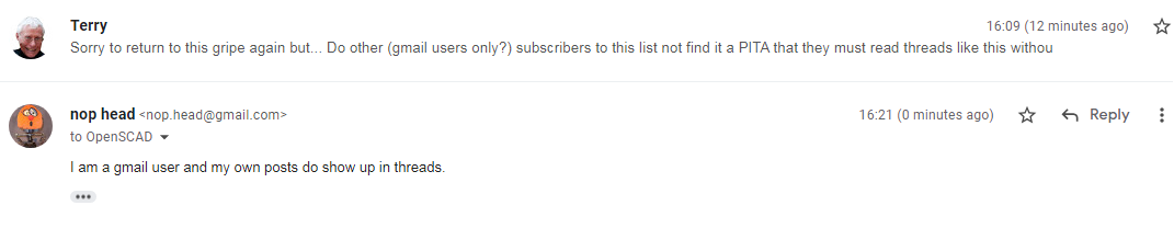 I am a gmail user and my own posts do show up in threads.