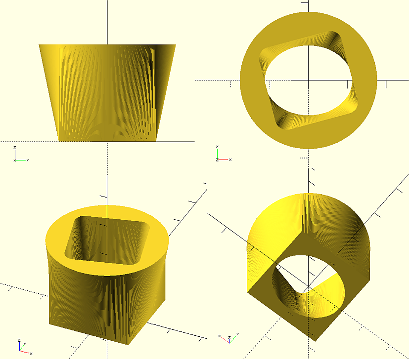 top profile is a circle with a z-rotated square hole with filleted corners.