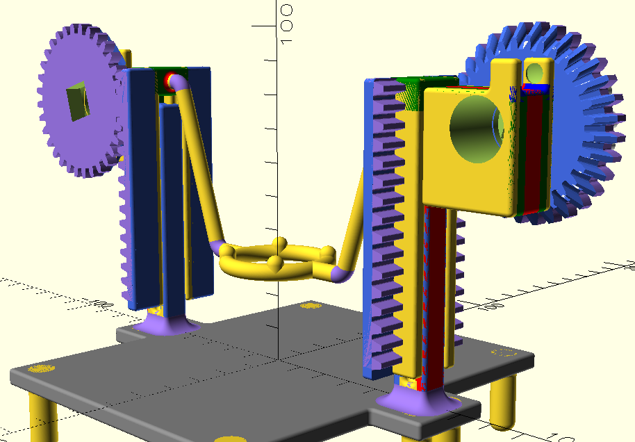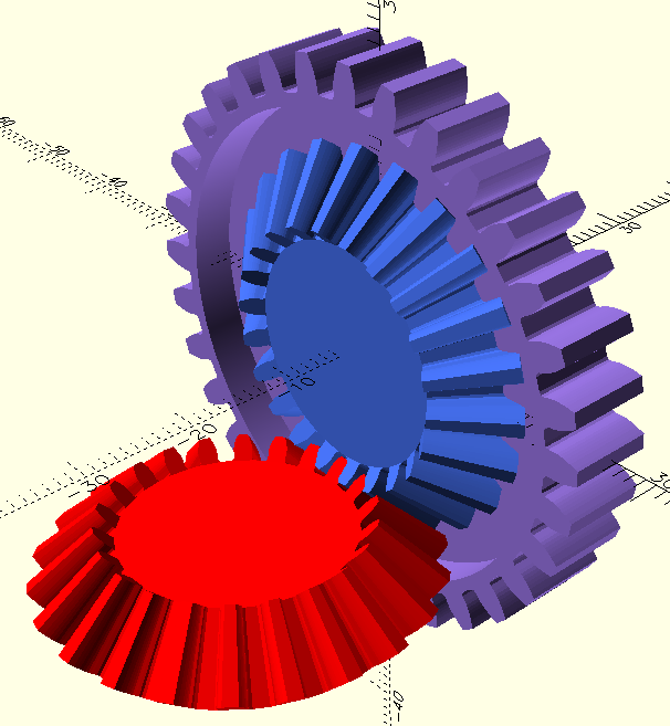 The purple part is the spur gear, and the blue part is the [should be] bevel gear. The blue is not really a bevel gear, it is just the linear_extrude of a spur_gear2d, so the involute stuff is not accurate. A second bevel (or what will be a bevel) gear will go below the existing bevel gear to create a vertical axle. My ultimate goal is to synchronize the spur gears by, after creating the vertical axles, adding a horizontal axle below the table. I have considered using an alternative approach of cutting out a cylinder from the center of the spur gear and placing a bevel gear inside, but it still involves the same number & type of gears in a similar arrangement, but at least placing it inside would prevent the bevel gear from interfering with the spur/rack interaction.