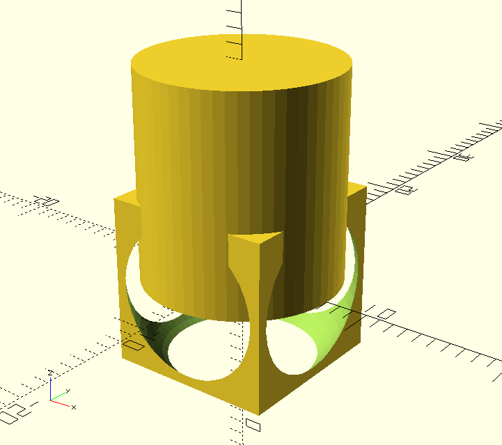 >> myShape = union() {myShape; cylinder(15, 7);};