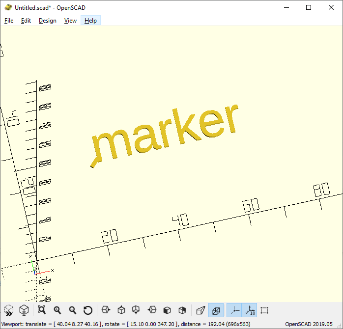 xrot([0,0,45]) xscale([3,1,1]) xtrans([10,0,10]) whereami("marker");