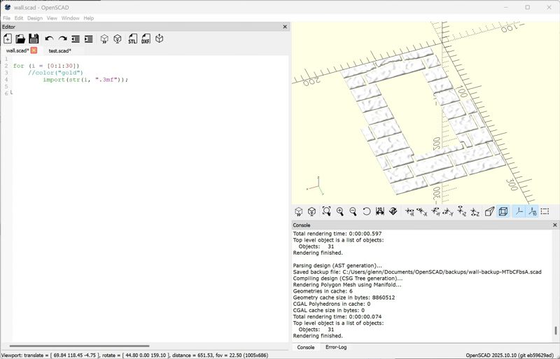 I'm working on a program that generates stone walls from images. I use OpenCV to extract the stone contours, which I combine with textures produced using a libnoise-based command line tool I wrote and the Manifold mesh library to make the stones. The program saves them as individual .3mf files.