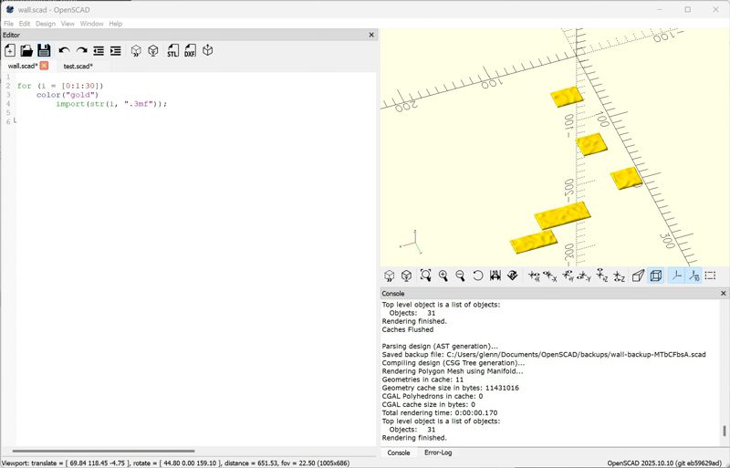 .zip file attached. I also included wall.scad, which has the loop to import the files. Comment-out the color() line to get nominal behavior.