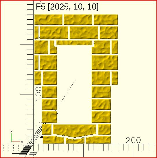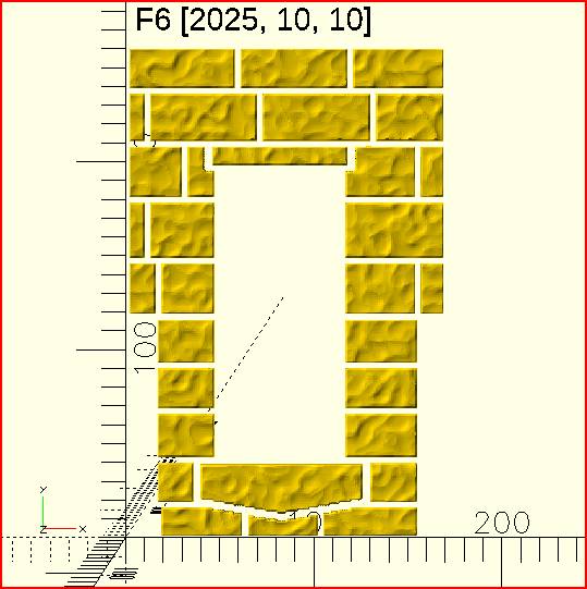 When I import the stones to do the further work in OpenSCAD (wall backing, window/door cutout and placement, etc.), the OpenSCAD behavior is definitely regressive. Here's what it should look like: