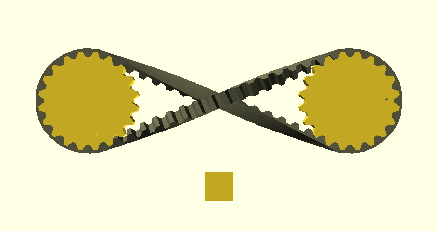 > I would be happy with a toothed belt going round two cogged wheels to start with - the basic application in the real world. From there I want to see if it is possible to get the belt crossed and twisted in the middle to drive the wheels in opposite directions.