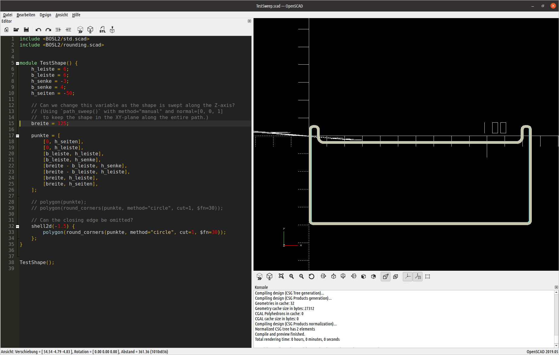 I think that I can move the shape along a smoothed path using path_sweep() with method="manual" and normal=[0, 0, 1], but how can I change it (i.e. the number breite in the code) as it is extruded?