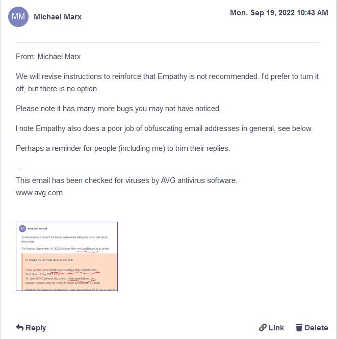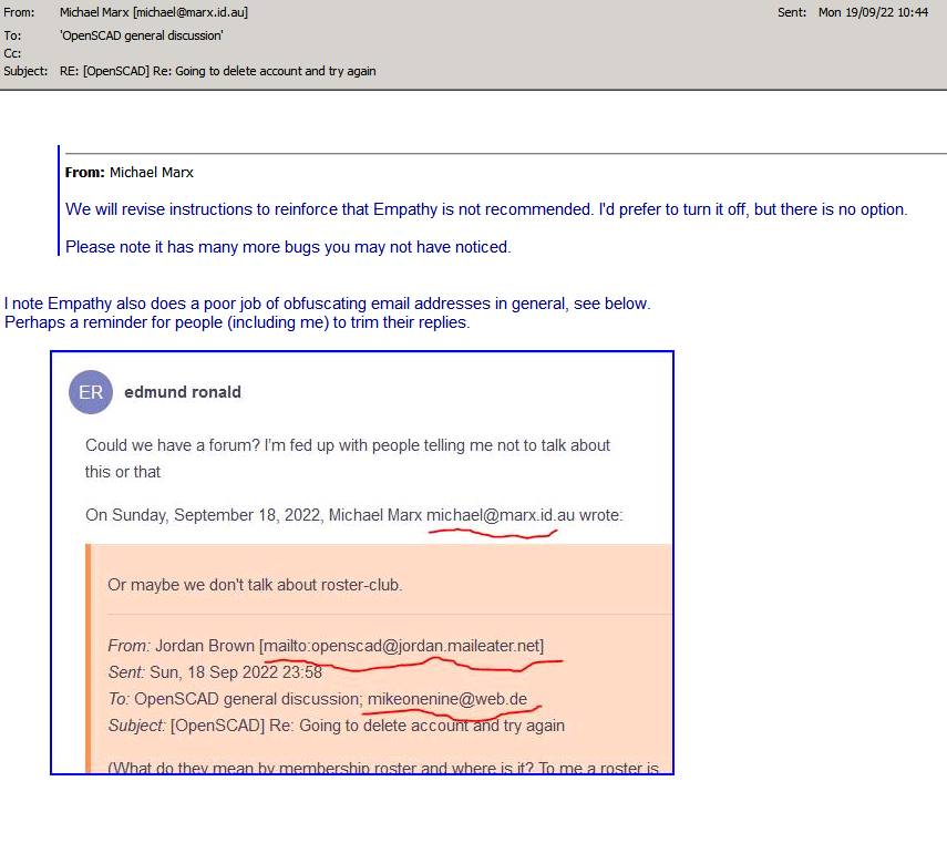 In his own words "When a list member registers with Affinity and then posts using Empathy's forum, the email address of the user is displayed instead of the user's real name."