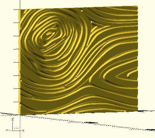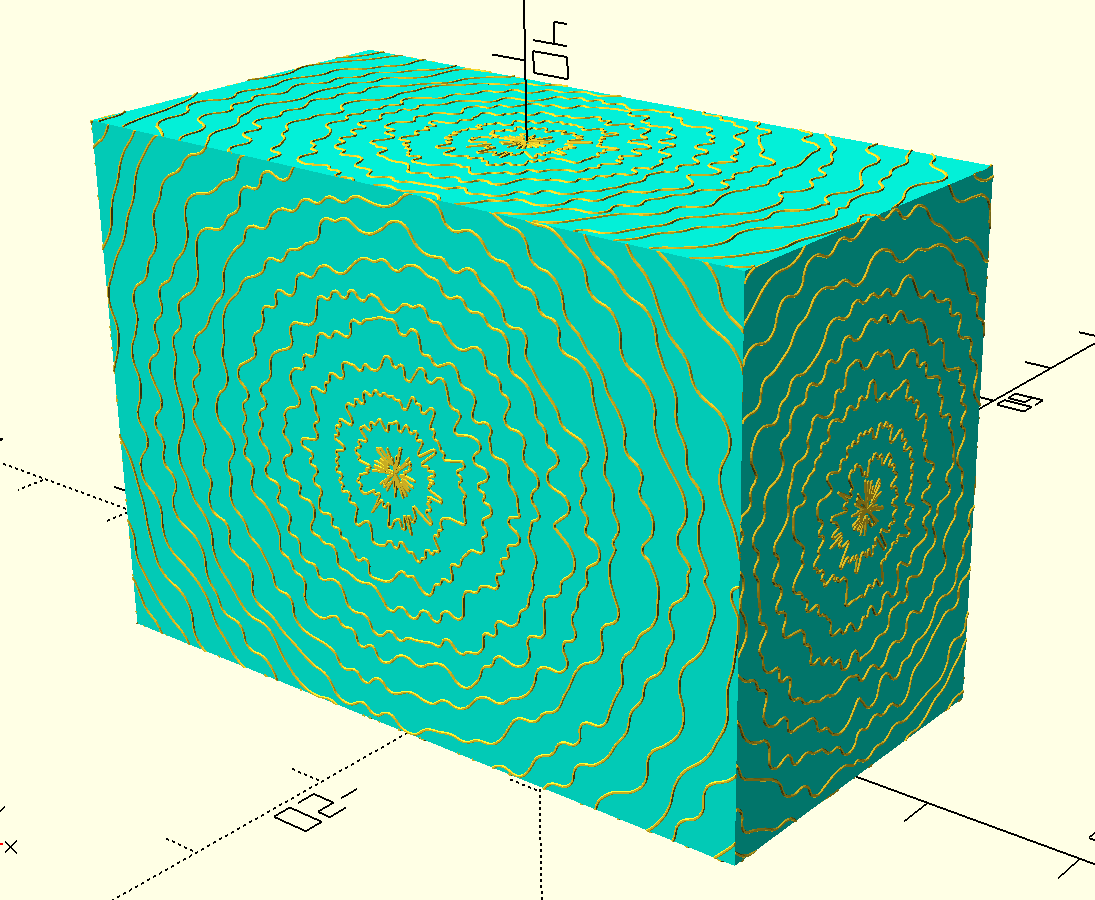 > I want to 3d-print a box that looks like it's made of wood. Therefore I decided to apply a texture (SVG) that resembles the annual rings of a tree. I want to apply that texture to the sides of the box. The printer cannot print overhangs without support structure, but overhanging angles of 45° (from base to overhanging outer side) are fine. So I thought I can convert the SVG to a 3d-structure with 45° rises on every side by using minkowski() and applying a cylindrical cone. Of course I need to cheat and convert the 2d SVG to 3d structure first by applying a linear_extrude() before applying minkowski();