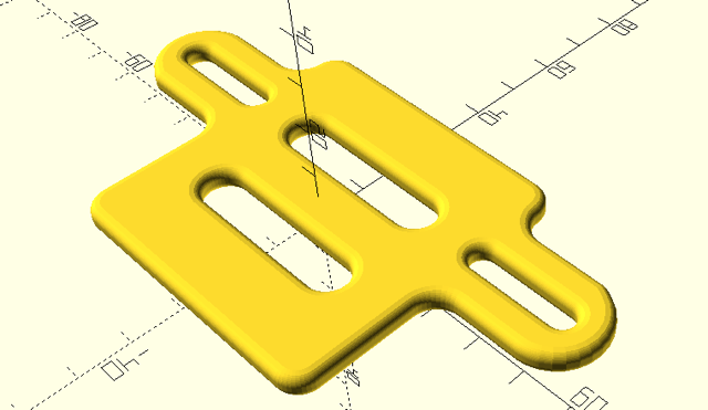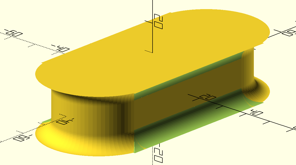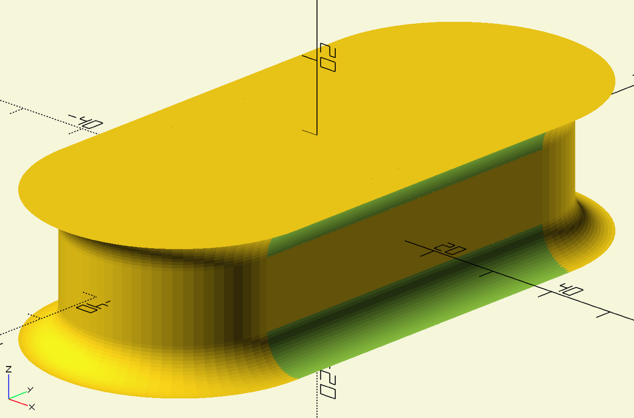 That gets you a straight-sided slot. Sculpt it as desired by subtracting stuff from the negative piece. Note, for instance, that a cylinder is a rotationally-extruded square, so if you want round edges at the ends you might take a square, subtract a circle along one edge, and rotationally extrude that. Similarly, the cube in the middle is an extruded square, so take a square, subtract circles on each side, and extrude that. However you construct it, when you have your negative “die”, subtract it from the main object. Always remember to make the negative object a little thicker than the original, so that it protrudes from both sides.
