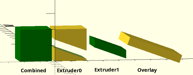 >> In this example the main object is a cube(20) and the section is rotated and is larger than the main object. The first color is the difference between the main object and the overlay, the second is the intersection of the two.
