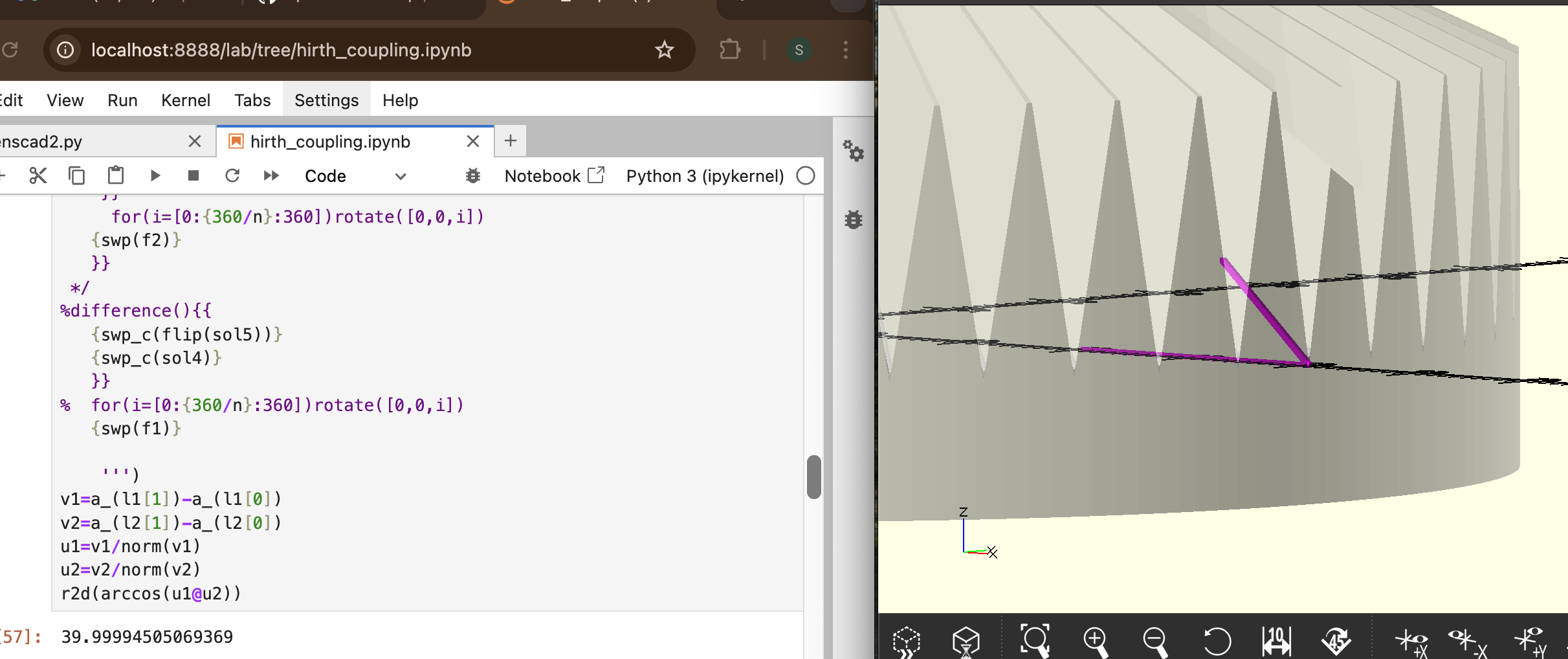 >>> In the image below, 60° triangles parallel to the z-axis linear_extruded