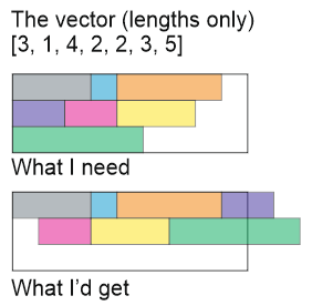 The setup is (simplified for this example): In a vector I have a number of vectors that define the dimesions of boxes (length, height). The width for all boxes is fixed, and all these boxes should be placed one immedialety after another, however, when the total length exceeds a given maxWidth, the starting x-position should be reset to zero and y should be increased by width.