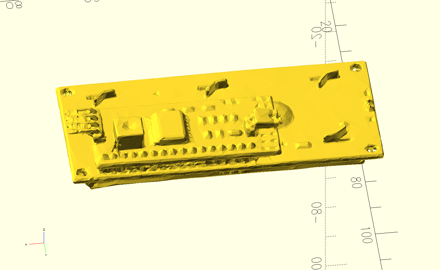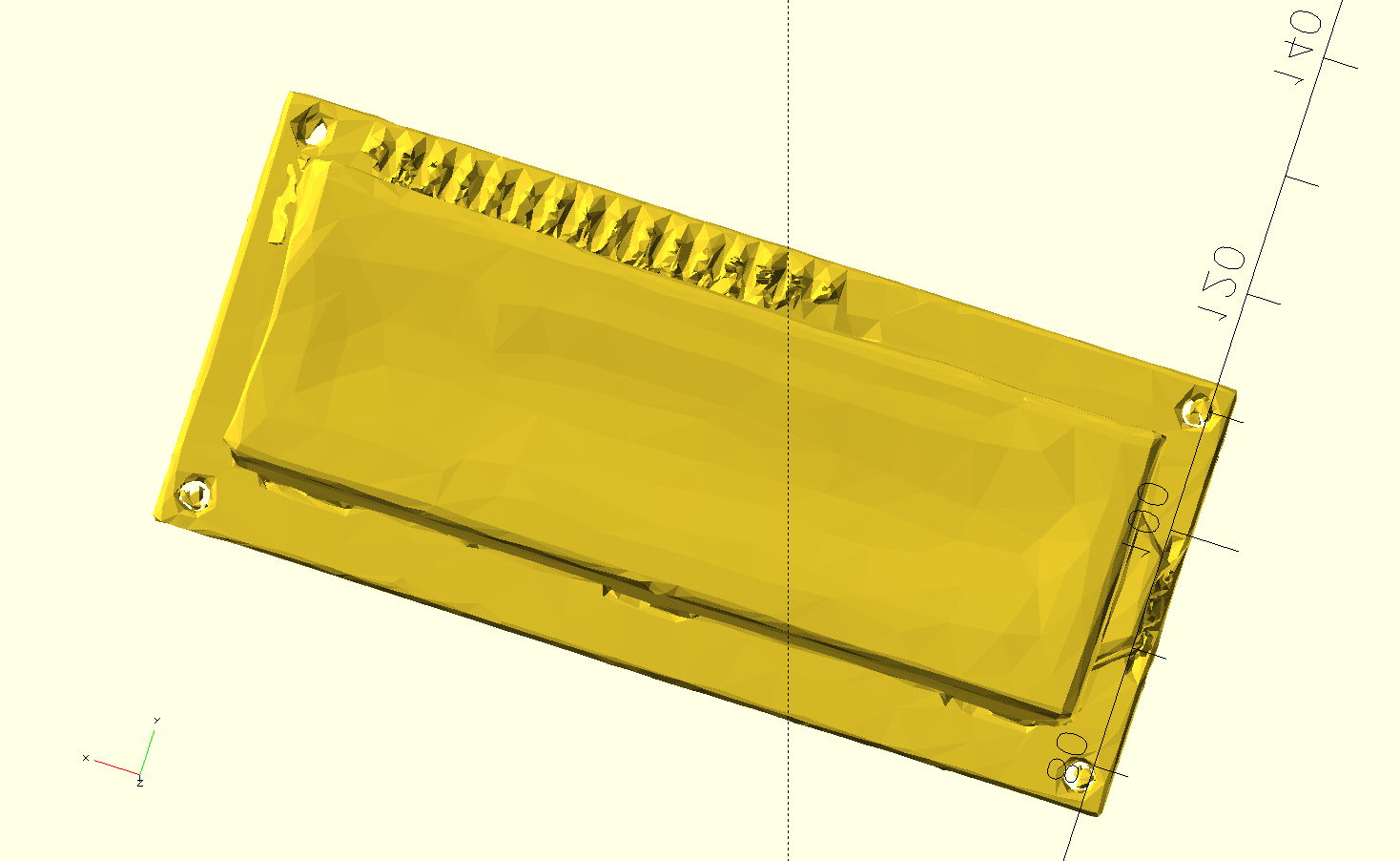 The main purpose for getting it was to easily/quickly model complicated electronics parts and assemblies so that I did not need to model them myself in native OpenSCAD. My first target was a 1602 LCD display with attached controller board. After learning the Miraco, it still took several iterations in PrusaSlicer to simplify and correct errors until I got an OBJ with enough detail AND could be imported into OpenSCAD in a reasonable amount of time: