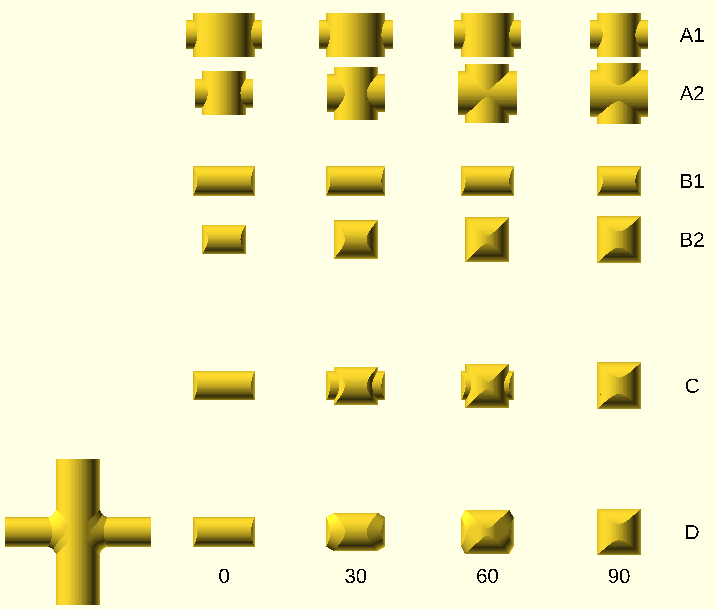 Finally, the shapes in row D are unioned to produce the final shape to the
