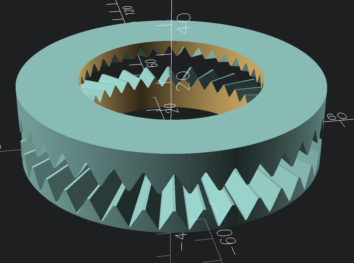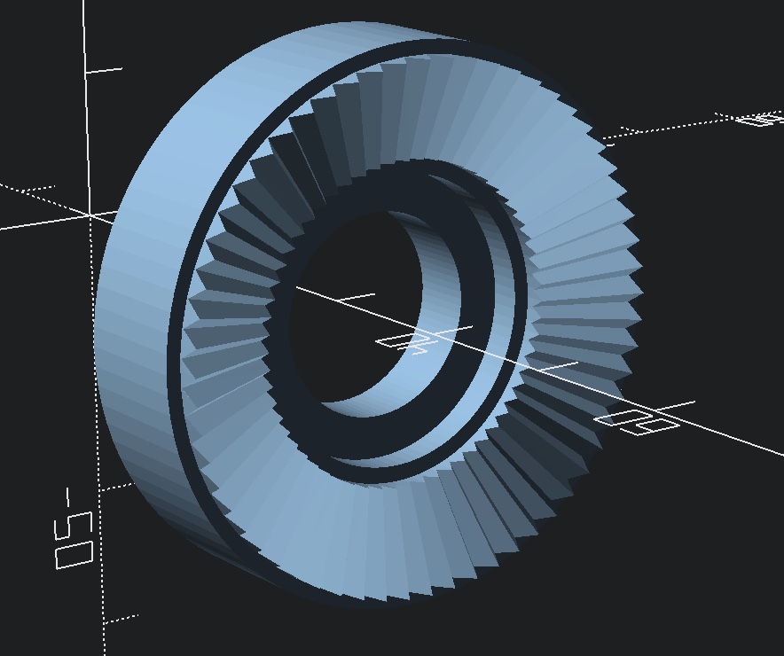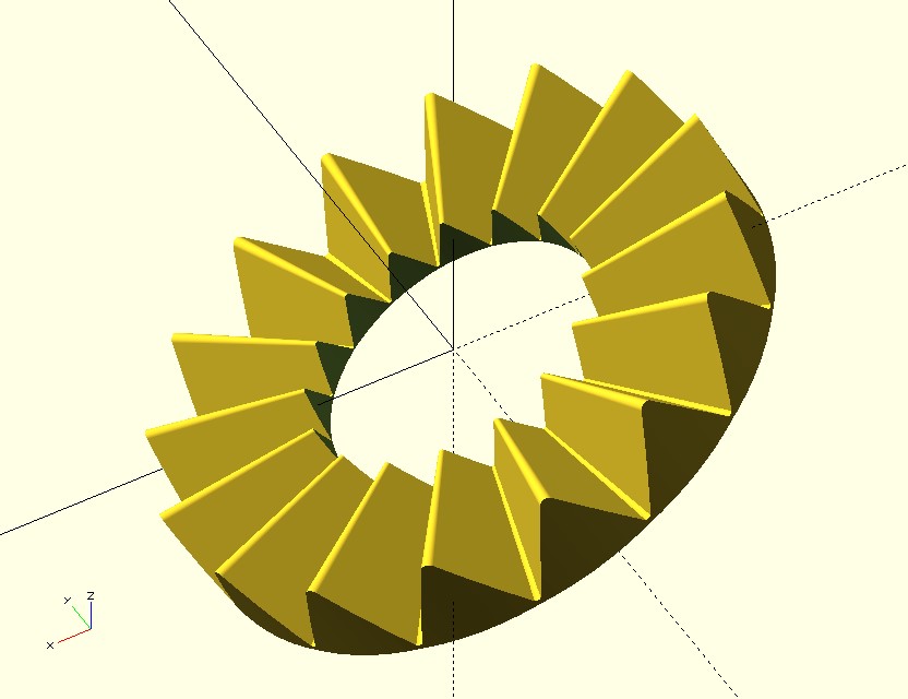 I got interested in the Hirth joint problem since I now know the name and understand what’s going on. Also, the part I needed to make had a conical Hirth joint. I was curious how that could be parameterized. It turned out to be fairly simple. Here is the current state of my test program. It uses BOSL2, but not my own library. It’s set up with the customizer so it’s easy to play around with. I’m running it on OpenSCAD.24.09.20 and BOSL2 from maybe a couple of months ago. It’s not entirely debugged, but works. Using hull and cheating a little, the math is minimal. It’s all in calculating toothBaseWidth and toothHeight. The “cheat” is that I hull the tooth profile with a tiny cube at the origin. For a conical joint, the origin just moves up. Most of the code is actually there to provide the base above or below the teeth. That’s where I think bugs still lurk.